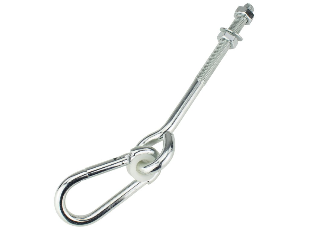 Houpačkový hák pro zavěšení houpačky do horní části dřevěné konstrukce dětského hřiště. Tento hák je vhodný pro kulaté i hranaté konstrukce do kterých se vyvrtá díra skrz a závěs se s obou stran přitáhne maticemi.